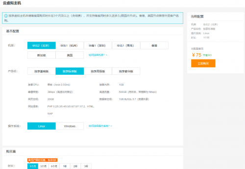 买一个虚拟空间,我选择的是国内的空间(我的域名已经备案),某个低价空间,1G的空间和数据库,花了75块钱每个月。选择linux,就是自带php环境的空间。
