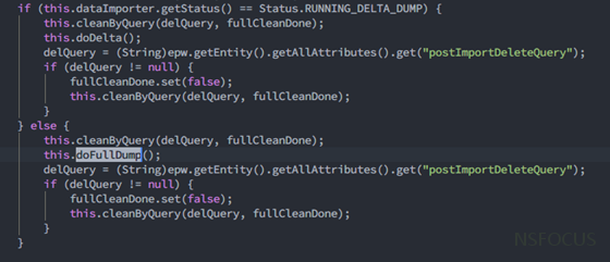 apache这个漏洞影响范围较广低于solr 8.2.0版本的都会受到漏洞的影响与攻击,本身这个solr模块就支持从远程的地址进行数据的收集与导入功能,当用户对dataimport进行使用的时候首先会调用handleRequestBody类,并将请求的模块进行重新配置,默认代码会对params.getDataConfig()参数里post值进行判断,当值为空就不会加载dataconfig里的配置,截图如下: